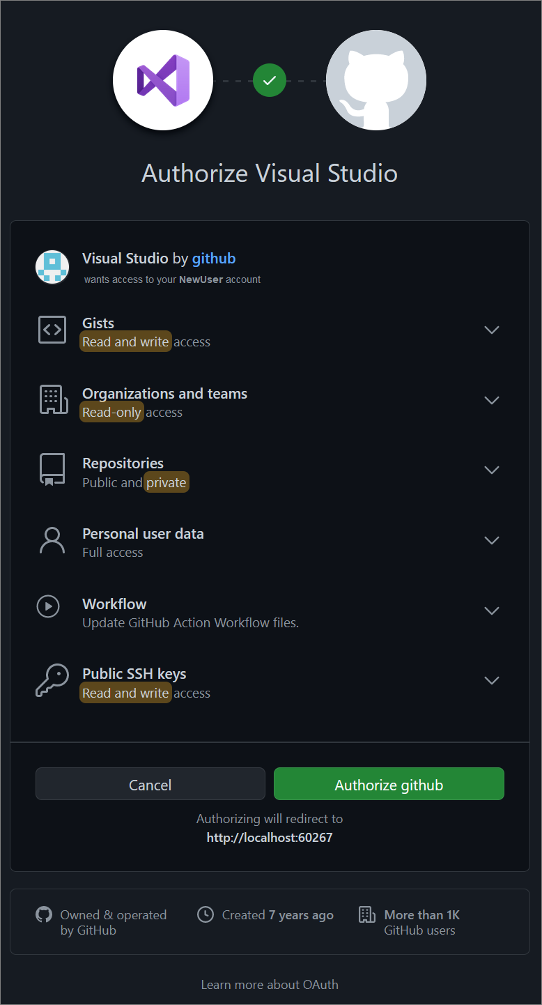 如果第一次从 Visual Studio 登录到 GitHub,则会显示 “授权 Visual Studio ”通知。 选择所需的选项,然后选择“ 授权 github”。