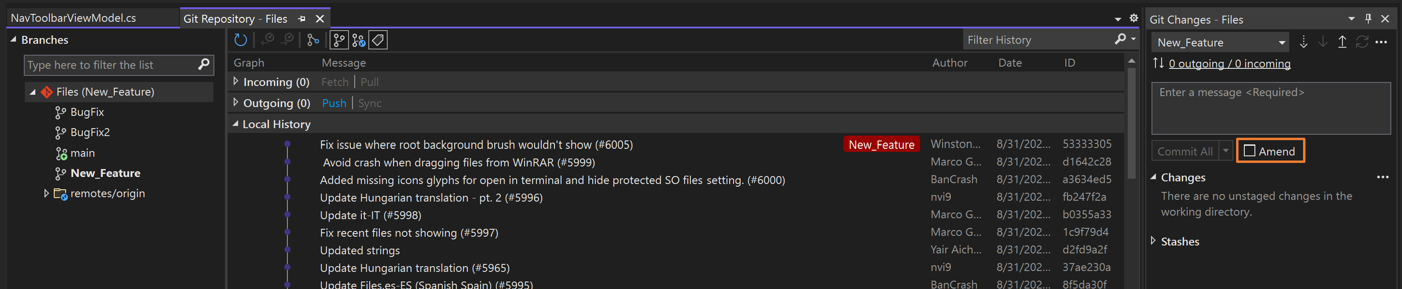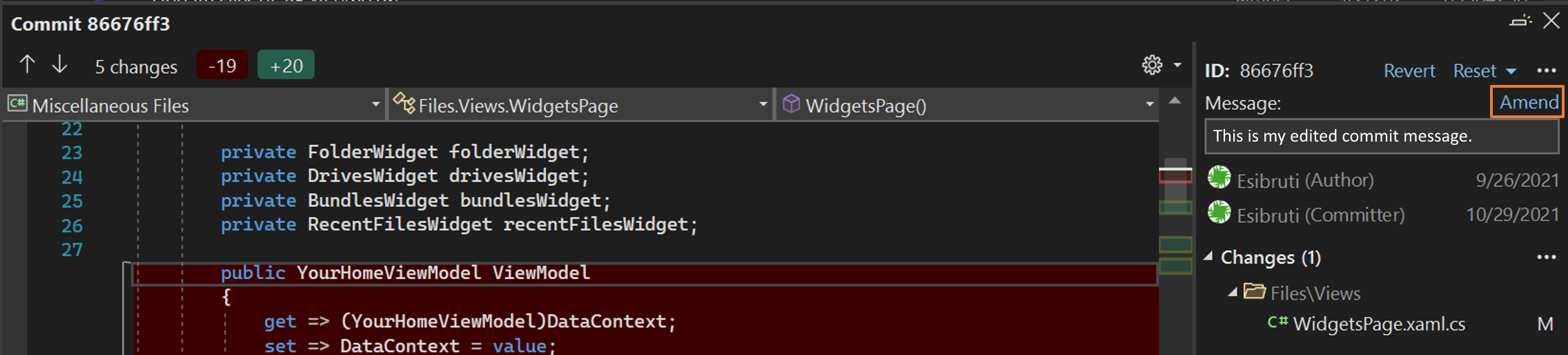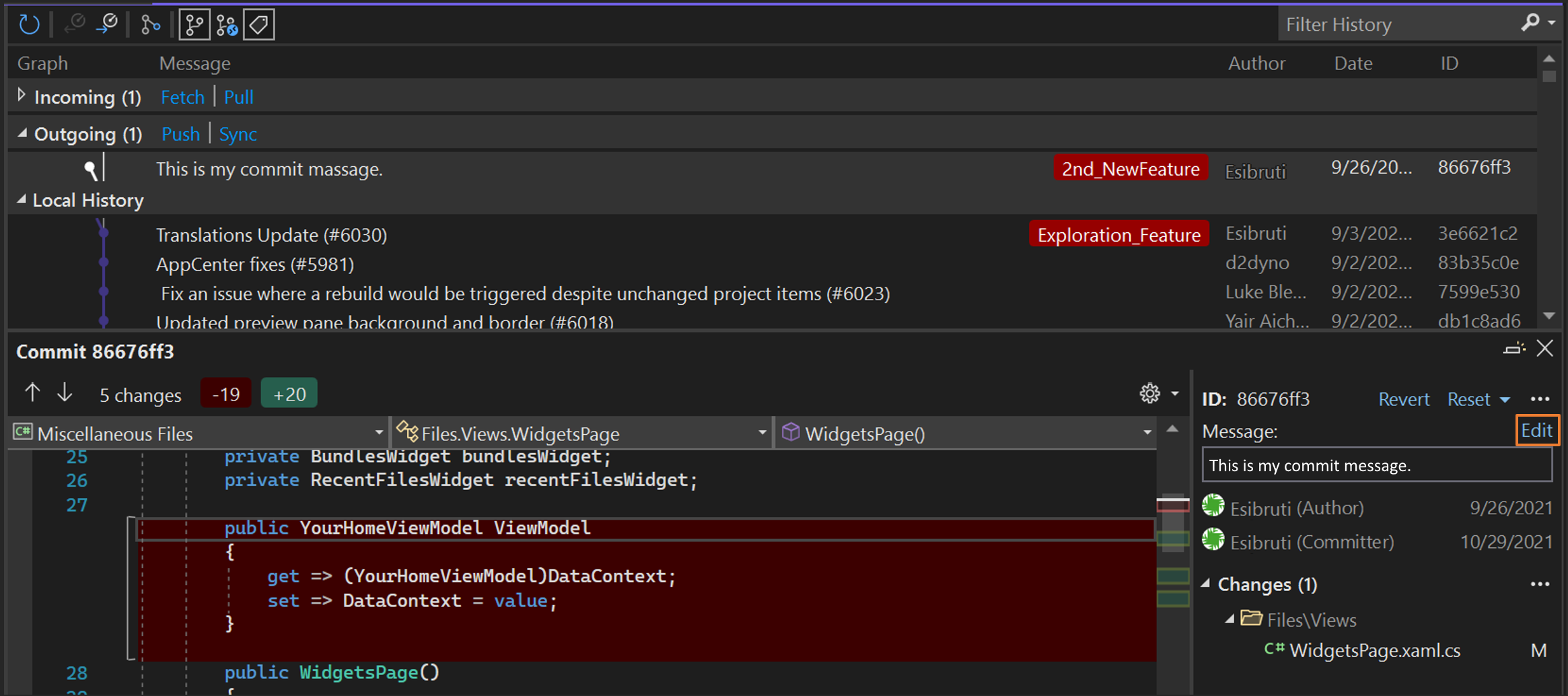 Git 存储库 窗口可以轻松更新最新的提交消息。 双击上次提交打开上次提交的提交详细信息,然后选择提交消息旁边的“编辑”选项。