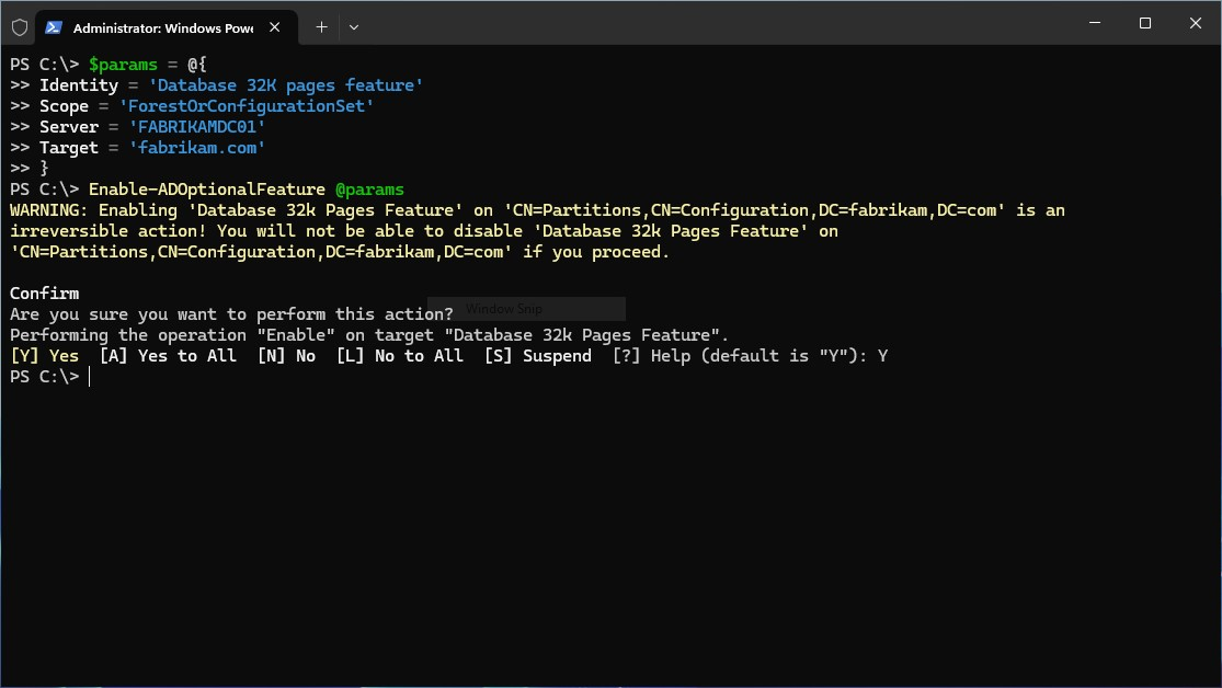 FABRIKAMDC01域中名为fabrikam.com的设备启用此功能。 确保将Server和Target参数的值替换为你自己的值。$params = @{ Identity = 'Database 32k pages feature' Scope = 'ForestOrConfigurationSet' Server = 'FABRIKAMDC01' Target = 'fabrikam.com' } Enable-ADOptionalFeature @params运行该命令时,会提示你确认操作。 输入 “是 ”或 “是”以全部 继续。 输出示例如下列图像所示。
