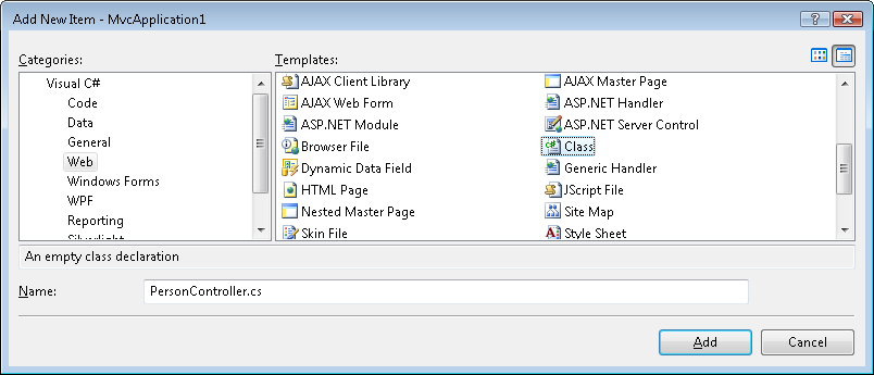 ASP.NET MVC 控制器只是類別。 如果您想要的話,您可以忽略方便的 Visual Studio 控制器 Scaffolding,並手動建立控制器類別。 執行下列步驟: