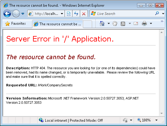 如果您嘗試在瀏覽器的網址列中輸入 /Work/CompanySecrets 來叫用 CompanySecrets() 控制器動作,則您會在圖 1 中接到錯誤訊息。