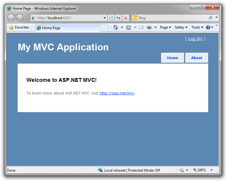 此預設範本開箱即用,為您提供兩個可供存取的頁面和一個基本的登入頁面。 讓我們改變這個應用程式的工作方式,並在過程中了解一些關於 ASP.NET MVC 的知識。 關閉瀏覽器並讓我們更改一些程式碼。