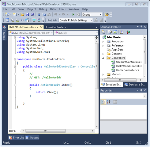 URL 的第一部分決定要執行的控制器類別。 因此 /HelloWorld 對應到 HelloWorldController 類別。 URL 的第二部分確定要在類別上執行的 Action 方法。 因此 /HelloWorld/Index 將導致 HelloWorldController 類別的 Index() 方法執行。 請注意,我們只需造訪上面的 /HelloWorld 並且隱含了方法 Index。 這是因為,如果未明確指定,名為「Index」的方法是控制器上將呼叫的預設方法。