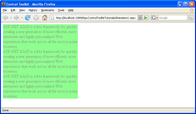 ASP.NET AJAX Control Toolkit 中的動畫控制項不只是控制項,而是將動畫新增至控制項的整個架構。 本教學課程示範如何設定這類動畫。