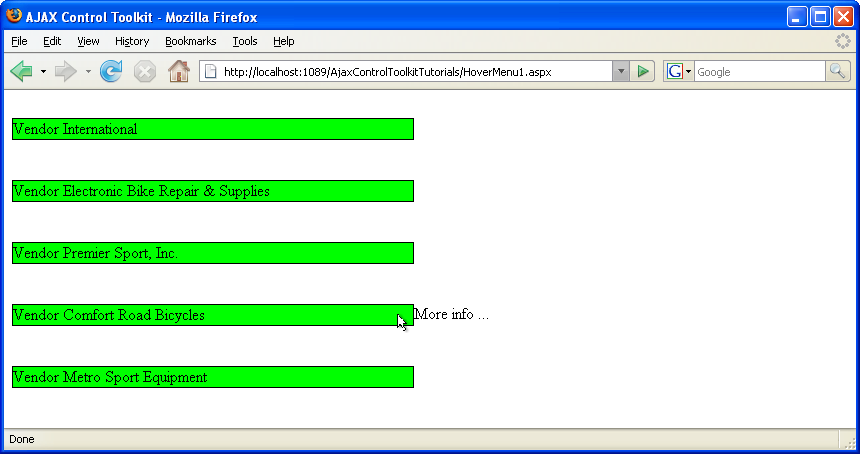 HoverMenu AJAX 控制項工具組中的控制項提供簡單的快顯效果:當滑鼠指標停留在元素上時,彈出視窗會出現在指定的位置。 您也可以在重複項內使用此控制件。