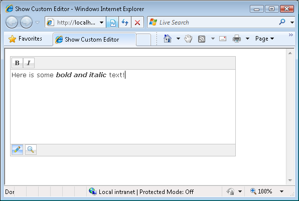 您可以從基底編輯器類別衍生新的 HTML 編輯器,以自訂工具列按鈕。 例如,清單 2 中的自訂編輯器只包含粗體和斜體工具列按鈕。 所有其他工具列按鈕都已移除。 此外,已從編輯器底部移除 HTML 索引標籤 (,但 [設計] 和 [預覽] 索引標籤仍) 。
