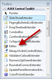 HTML 編輯器控制項位於工具箱中,其餘的 AJAX 控制項工具組控制項。 其名稱為編輯器控制項 (請參閱圖 3) 。