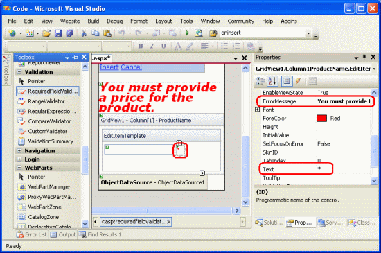 接下來,將 RequiredFieldValidator 的 ControlToValidate 屬性設定為 EditProductName。 最後,將 ErrorMessage 屬性 設定為 「您必須提供產品名稱」, 並將 Text 屬性 設定為 “*”。 如果提供,屬性值 Text 就是驗證控件在驗證失敗時所顯示的文字。