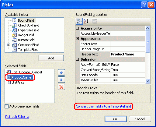圖 3:將 DetailsView 和 GridView 的 BoundFields 轉換成 TemplateFields(單擊以檢視完整大小的影像)