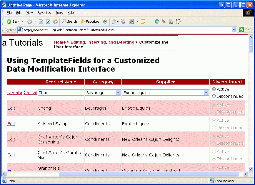 在上一個教學課程中,我們已瞭解如何藉由新增驗證 Web 控件來自定義數據修改介面。 在本教學課程中,我們將探討如何自定義實際的數據收集 Web 控件,以替代輸入 Web 控件取代 BoundField 和 CheckBoxField 的標準 TextBox 和 CheckBox 控制件。 特別是,我們將建置可編輯的 GridView,以允許更新產品的名稱、類別、供應商和已停止狀態。 編輯特定數據列時,類別和供應商欄位會轉譯為DropDownLists,其中包含一組可用的類別和供應商可供選擇。 此外,我們將以 RadioButtonList 控件取代 CheckBoxField 的預設 CheckBox,其提供兩個選項:“Active” 和 “Discontinued”。