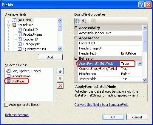 圖 7:據以設定 UnitPrice的 DataFormatString 和 HtmlEncode 屬性 (按一下以檢視完整大小的影像)