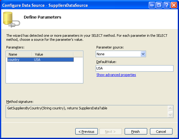 GetSuppliersByCountry(country)由於 方法接受參數,[設定數據源精靈] 會提示我們輸入該參數的來源。 若要指定硬式編碼值 (在此範例中為USA),請將 [參數來源] 下拉式清單保留為 [無],然後在文本框中輸入預設值。 按一下 [完成] 以完成程序。