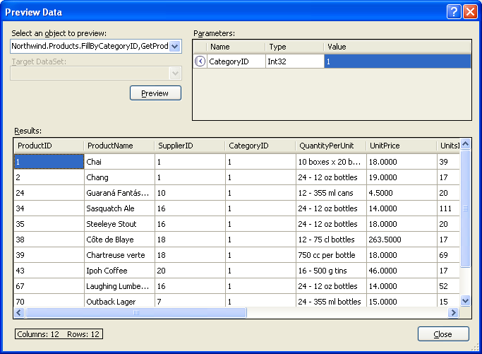 此時,我們有具有單一 DataTable (Northwind.Products) 的具型別數據集,以及具有 GetProducts() 方法的強型別 DataAdapter 類別(NorthwindTableAdapters.ProductsTableAdapter)。 這些物件可用來從程式代碼存取所有產品的清單,例如: