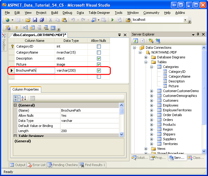 Categories 資料表已經有一個 Picture 列,用於儲存該類別圖片的二進位內容。 我們將新增一個附加列 BrochurePath,以在 Web 伺服器的檔案系統上儲存 PDF 的路徑,該路徑可用於提供列印品質的、精美的類別概述。