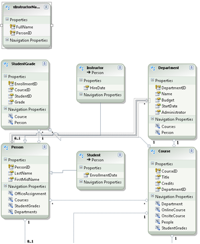 在 Visual Studio 中,使用Entity Framework 和 Web Form教學課程系列開啟您在消費者入門中建立的 Contoso University Web 應用程式,然後開啟 SchoolDiagram 資料庫關係圖。