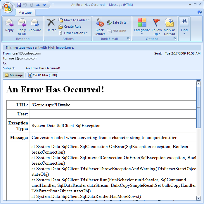 圖 2 顯示造訪 Genre.aspx?ID=foo時收到的電子郵件。 電子郵件本文摘要說明例外狀況資訊,而 YSOD.htm 附件會顯示例外狀況詳細數據 YSOD 中顯示的內容(請參閱 圖 3)。