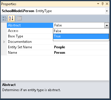 現在,實體 Person 只有通用 Instructor 的屬性和 Student (實體,除了您不移動的導覽屬性之外,您不會移動) ,實體只能當做繼承結構中的基底實體使用。 因此,您必須確保它永遠不會被視為獨立實體。 以滑鼠右鍵按一下 Person 實體,選取 [ 屬性],然後在 [ 屬性 ] 視窗中,將 Abstract 屬性的值變更為 True。