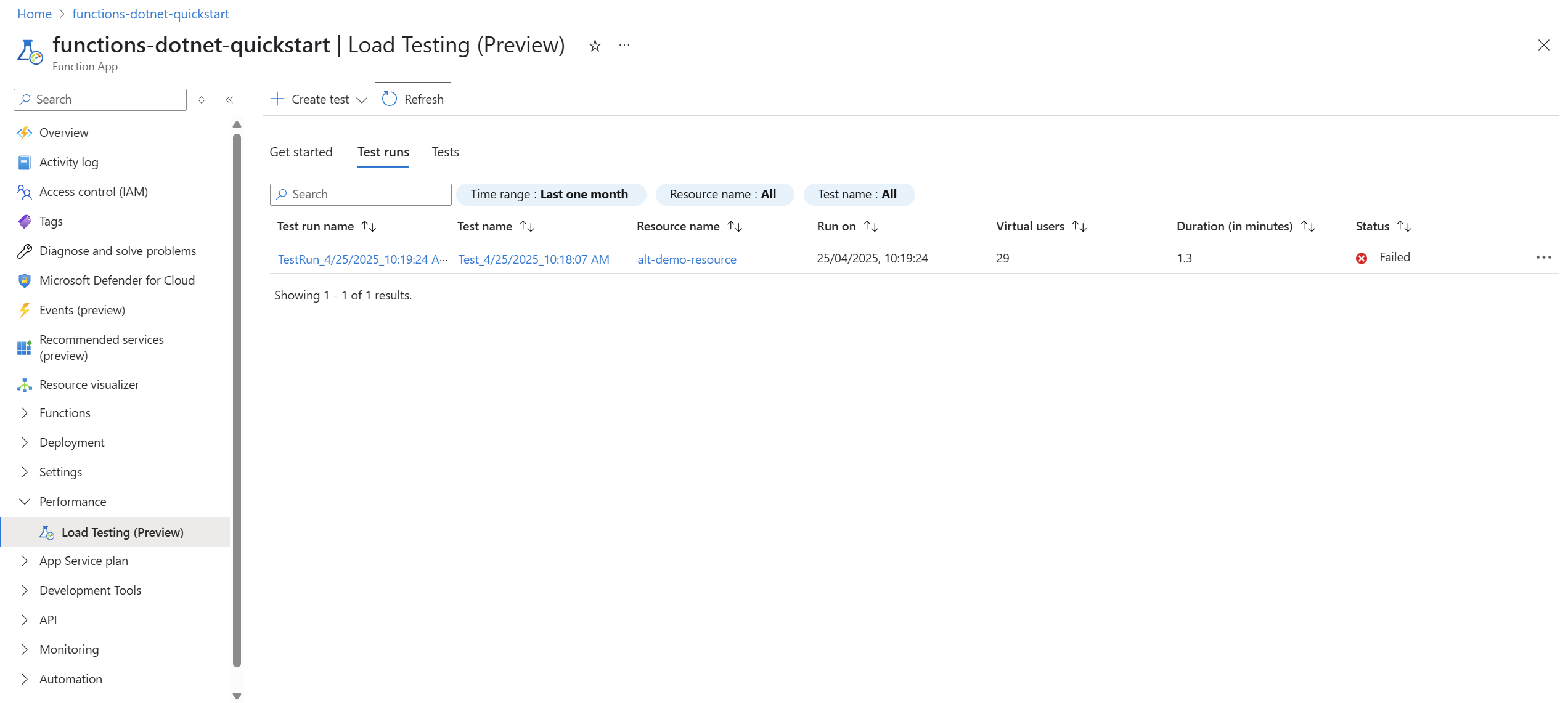 在此頁面上,您可以看到此函式應用程式的測試和負載測試回合清單。