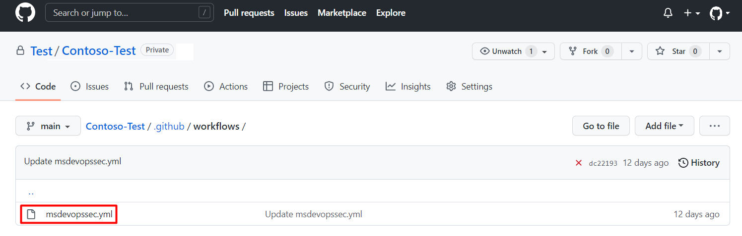 Your repository's home page>.github/workflows。選取在必要條件中建立的 msdevopssec.yml。