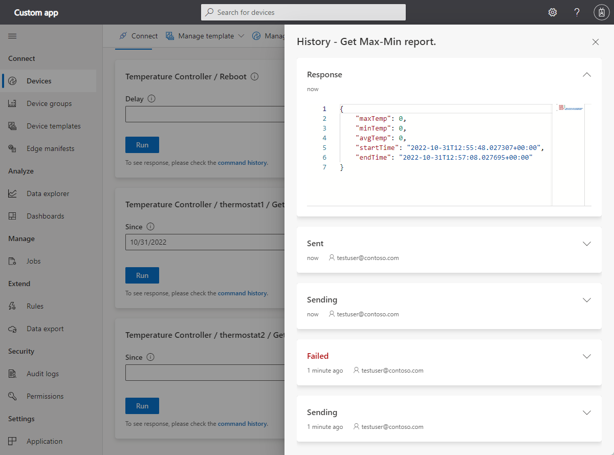 操作員可以使用 IoT Central UI 在裝置上呼叫命令。 命令控制裝置的行為。 例如,操作員可能會呼叫命令來重新啟動裝置或收集診斷資料。