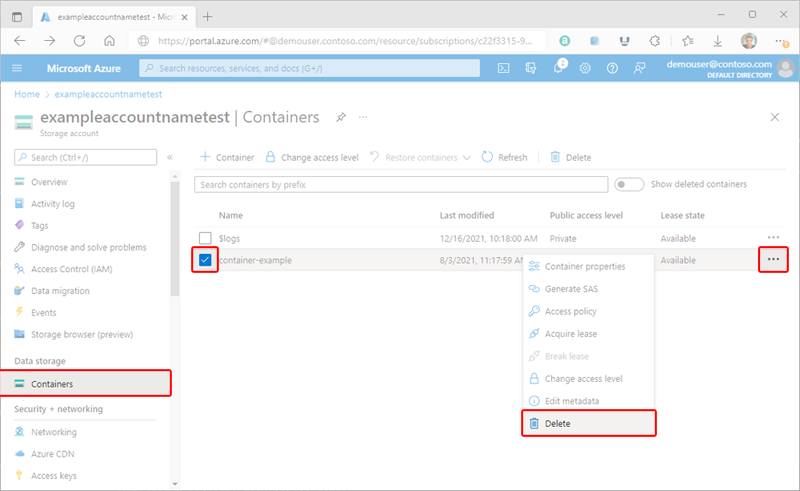 遵循下列步驟可能會永久刪除容器及其內的任何 Blob。 Microsoft 建議啟用容器虛刪除,以保護容器和 Blob 免於意外刪除。 如需詳細資訊,請參閱 容器的軟刪除。