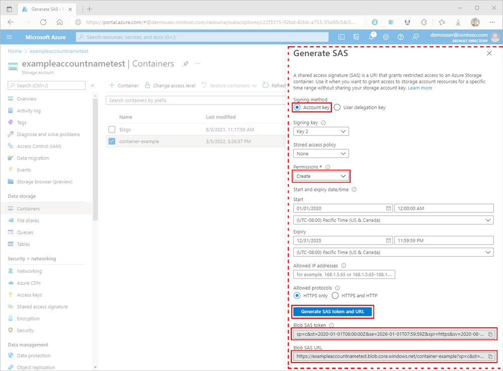 檢閱您的設定以取得正確性,然後選取 [產生 SAS 權杖和 URL ] 以顯示 Blob SAS 權杖 和 Blob SAS URL 查詢字串。