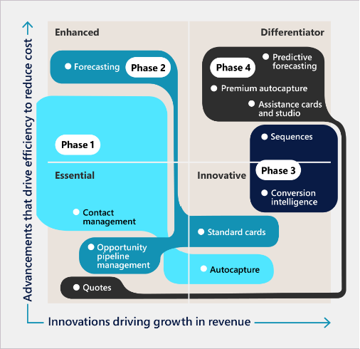 A better approach is to plan your phases so that you can include features from different quadrants of the transformation map. You want to deliver a holistic solution that has the key process elements, integrations, and reporting that create value. You also want to look for quick wins: the latest Dynamics 365 features that you can easily adopt with little effort to bring innovation and differentiation to your app.