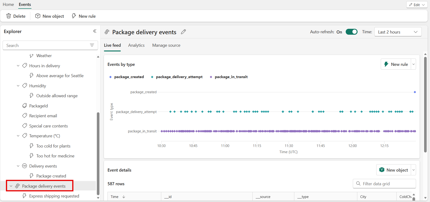 在 [瀏覽器] 窗格中,選取名為 傳遞事件 的物件。 您可以針對使用包裹運送事件數據流之對象建立規則。 例如,檢查包裹溫度的規則。