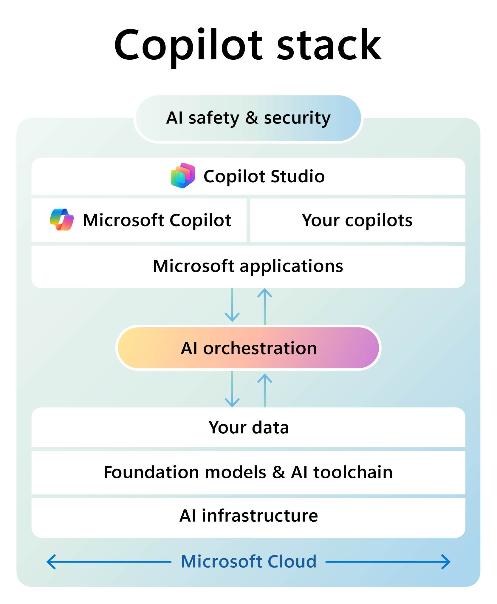 Microsoft Copilot 堆疊包含三個不同的層:後端(位於個別存放庫的數據)、中間的 AI 協調流程層,以及前端(您 copilot 的 UI 體驗)。 在每一層中,建置 Copilot 時,建議考慮的圖層。