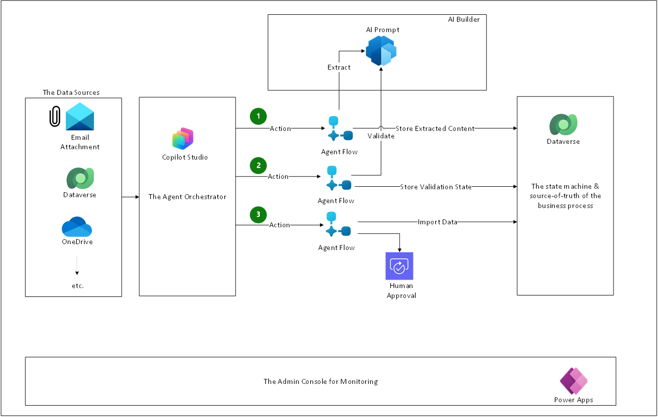 觸發器標識新文檔何時準備好進行處理。 這顯示在體系結構圖的「數據源 」 區域中。 代理流 掃描 Outlook 郵箱或 SharePoint 資料夾等目錄。 將文件添加到任何目錄時,代理流會將該文檔存儲在狀態為「新建」的「數據處理事件」表中,並向代理發送一條消息: