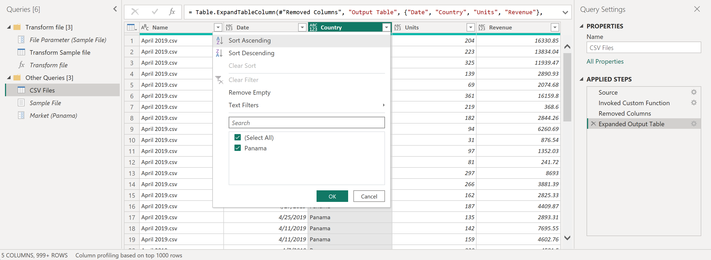 您現在可以返回 套用步驟中的 展開輸出數據表。 請檢查您的查詢,以確認只有 國家/地區 等於 巴拿馬 的數據列才會顯示在 CSV 檔案 查詢的最終結果集中。