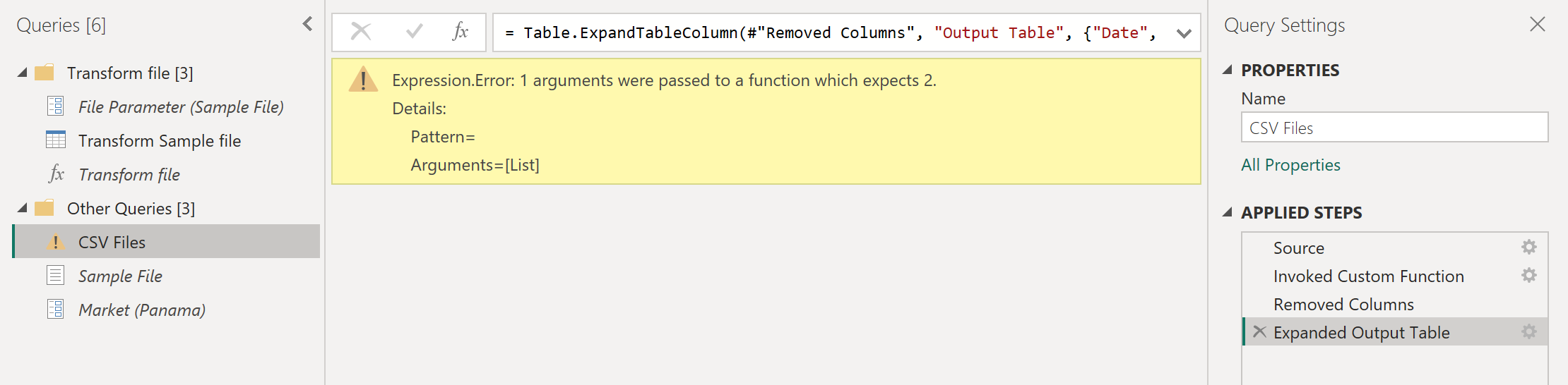 但是 CSV 檔案 查詢旁邊有警告符號。 現在您的函式已更新,它需要兩個參數。 因此,調用函式的步驟會產生錯誤值,因為在 調用自定義函式 步驟期間,只有其中一個參數傳遞至 轉換檔案 函式。