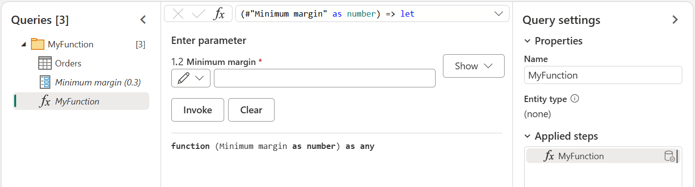 你可以隨意命名這個新函式。 為了示範目的,這個新函式的名稱是 MyFunction。 選擇 確定後,會在 查詢 面板中用你的新函式名稱建立一個新群組。 在這個群組中,你會找到用於函數的參數、用來建立函數的查詢,以及函數本身。