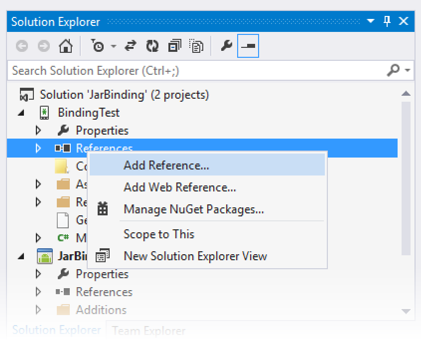 首先,建立取用系結連結庫的新 Xamarin.Android 應用程式。 以滑鼠右鍵按兩下 [方案],然後選取 [新增專案];將新專案 命名為 BindingTest。 我們會在與系結連結庫相同的解決方案中建立此應用程式,以簡化本逐步解說;不過,取用系結連結庫的應用程式可以改為位於不同的解決方案中: