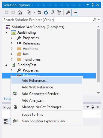 開啟 BindingTest 專案的 [參考] 節點,以確認 AarBinding 參考存在: