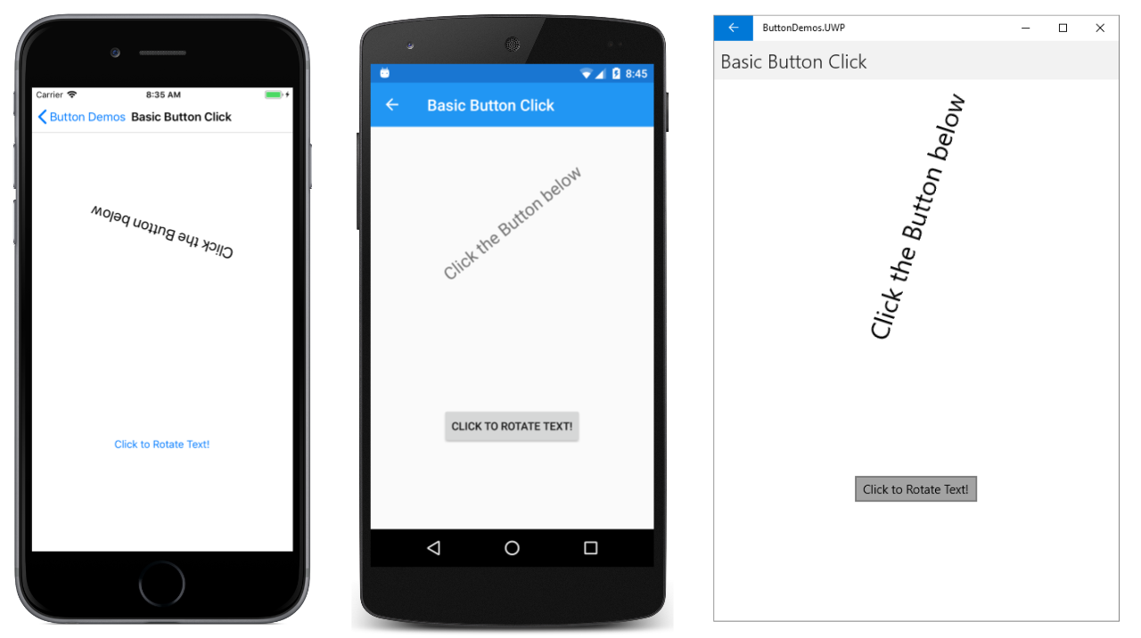 這個特定 Clicked 處理程式會呼叫動畫函式,以 1000 毫秒旋轉 Label 360 度。 以下是在 iOS 和 Android 裝置上執行的程式,以及作為 Windows 10 桌面上的 通用 Windows 平台 (UWP) 應用程式: