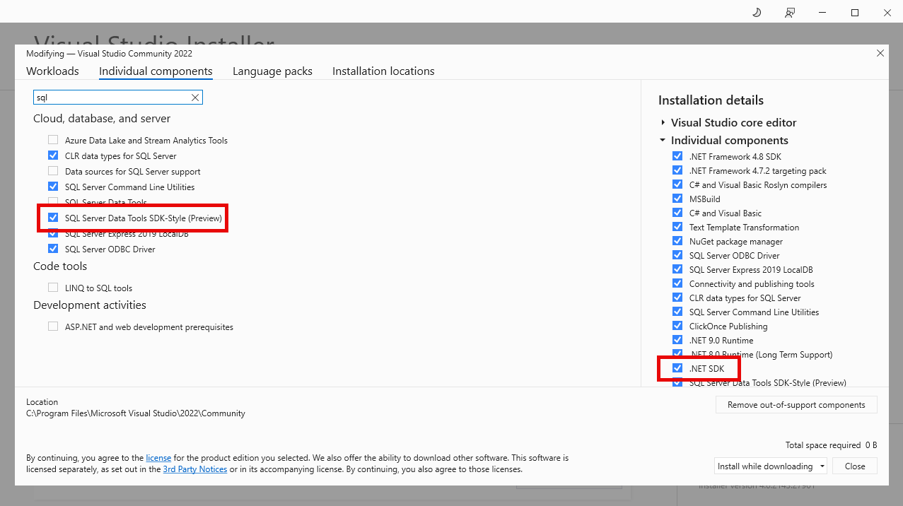 在安裝期間,選取 [個別元件]索引標籤並搜尋 “SQL”,找出並選取 "SQL Server Data Tools SDK-style (Preview)"。 選取此項目會自動選取必要的相依性。