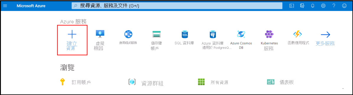 在 [Azure 服務] 下,選取 [建立資源]。