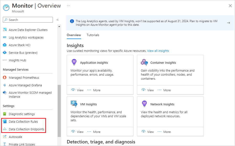 - 在 [Azure 監視器] 左側導覽功能表的 [設定] 下,選取 [資料收集端點]。
