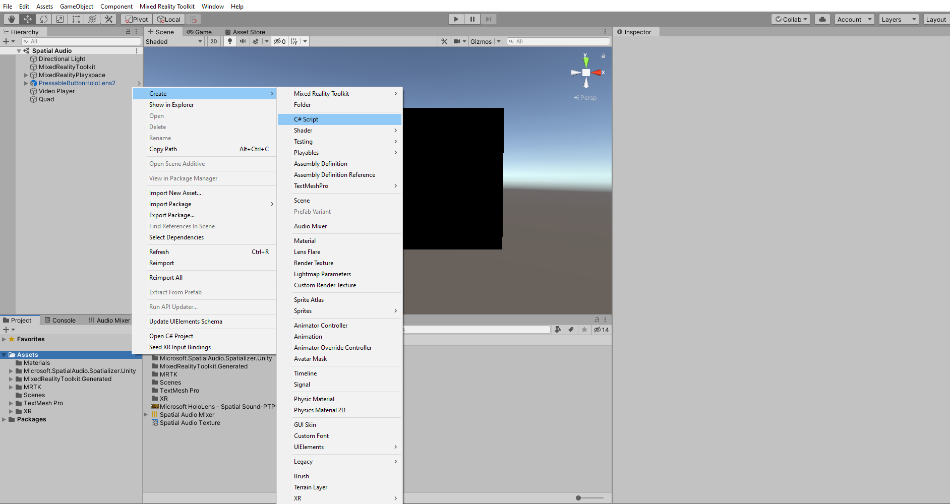 在 [專案] 視窗中按兩下滑鼠右鍵,然後選擇 [ 建立>C# 腳本 ] 以建立新的 C# 腳本。 輸入文本的適當名稱;例如 SpatializeOnOff。