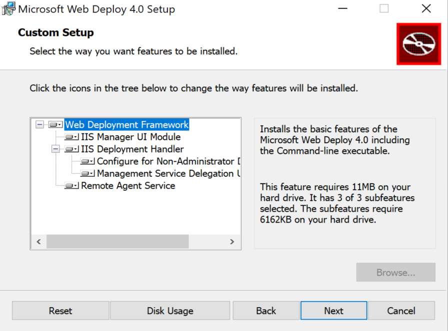 如果已安裝 Web Deploy,但仍收到此錯誤,請確定 已安裝 Web Deploy 中的 IIS 部署處理程式 功能。 在 [ 程式和功能] 控制面板中,尋找 Microsoft Web Deploy 4.0,以滑鼠右鍵按兩下它,然後選取 [ 變更]。 在即將出現的精靈中,選取 第一頁上的 [下一步 ],然後在第二個頁面上選取 [ 變更 ]。 新增 IIS 部署處理程式 及其下的所有專案。