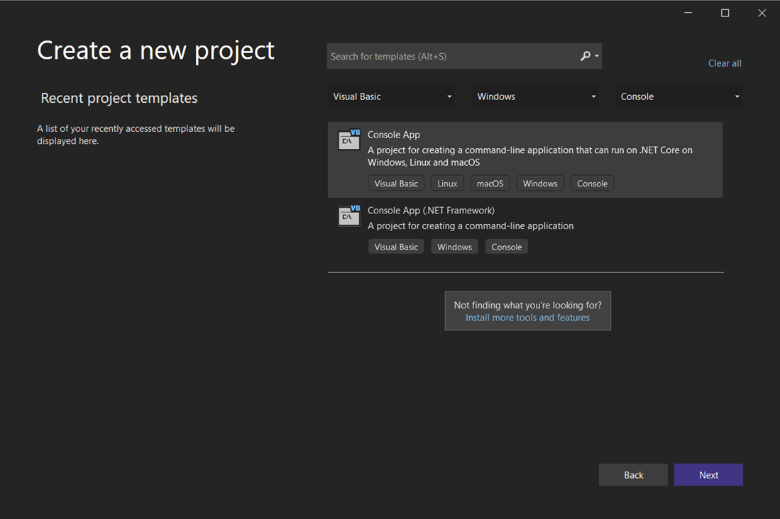 如果您沒有看到 主控台應用程式 樣本,您可以從 [建立新的 專案] 視窗 安裝它。 在 找不到您要找的嗎? 訊息中,選擇 安裝更多工具和功能 連結。