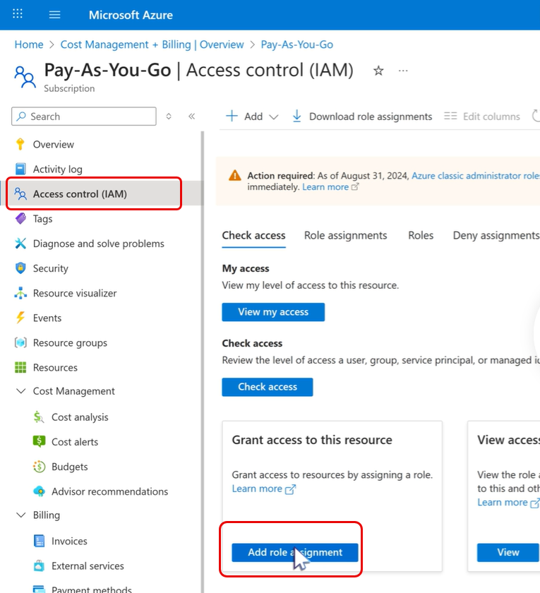 在「授予此資源存取權」圖塊中選擇 新增角色指派 。