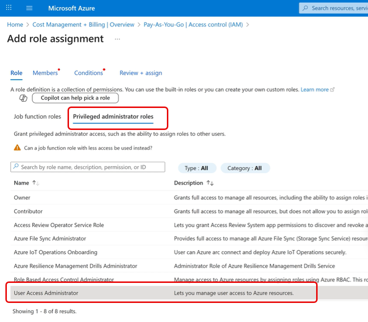 在 新增角色指派 畫面中,選擇「特權管理員」角色。