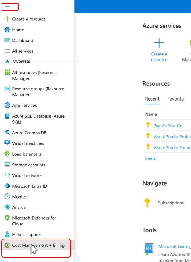 在左側面板,選擇 成本管理 + 帳單。